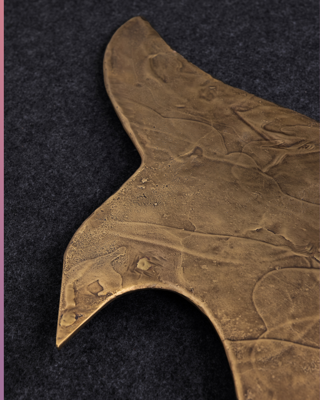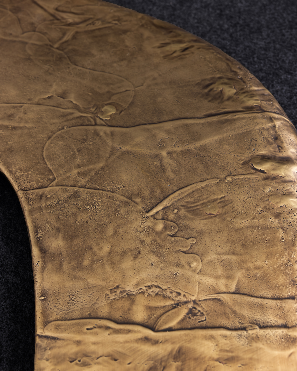 The surface itself carries a unique, organic texture, created during casting, that ripples across the brass in flowing patterns. This textural movement amplifies the sense of dynamism, as if the material itself were in motion. At the intersection of solidity and fluidity, strength and delicacy, the table embodies the essence of the collection: functional objects elevated into sculptural presences, transforming interiors into living galleries.